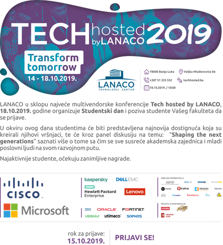 Lanaco u sklopu najveće multivendorske konferencije Tech Hosted by LANACO, 18.10.2019. godine organizuje Studentski dan i poziva studente da se prijave. U okviru ovog dana studentima će biti predstavljena najnovija dostignuća koja su kreirali njihovi vršnjeci, te će kroz panel diskusiju na temu: Shaping the next generations saznati više o tome sa čime se sve akademske zajenice susreću i mladi poslovni ljudi na svom putu. Najaktivnije studente očekuju zanimljive nagrade. Rok za prijavu 15.10.2019. Agena studentskog dana može se vidjeti na: http://techhosted.ba/2019.php |